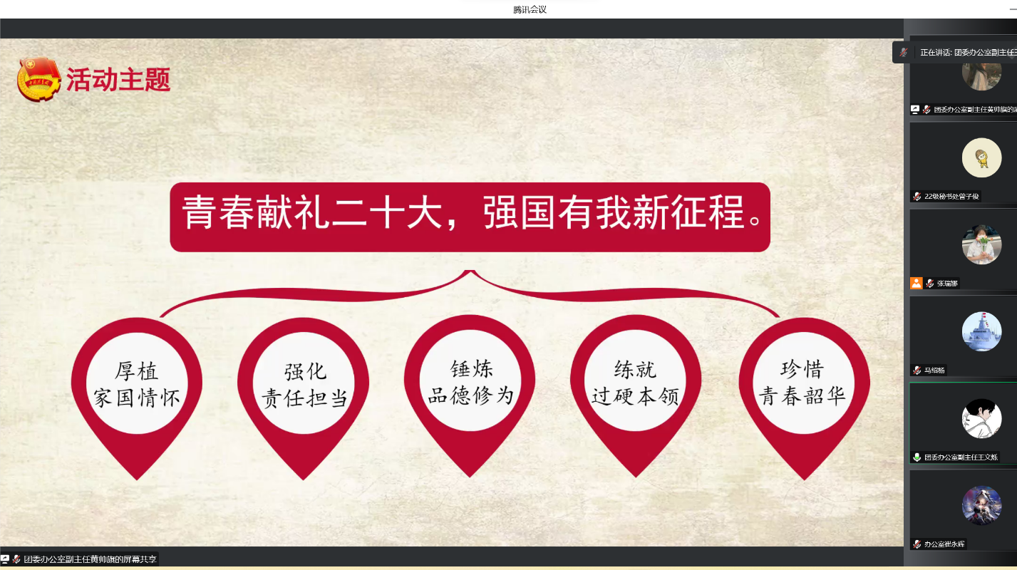为深入学习宣传习近平总书记在庆祝中国共产主义青年团成立100周年大会上的重要讲话精神,进一步提高新时代共青团的组织力、引领力、服务力、向心力,10月16日下午,伟德国际BETVlCTOR团委在线上召开第十四届任责杯团日活动宣介会,本次会议由张瑞娜主持,21、22级各班团支书、班长以及伟德国际BETVlCTOR团委综合办公室全体成员参加会议。