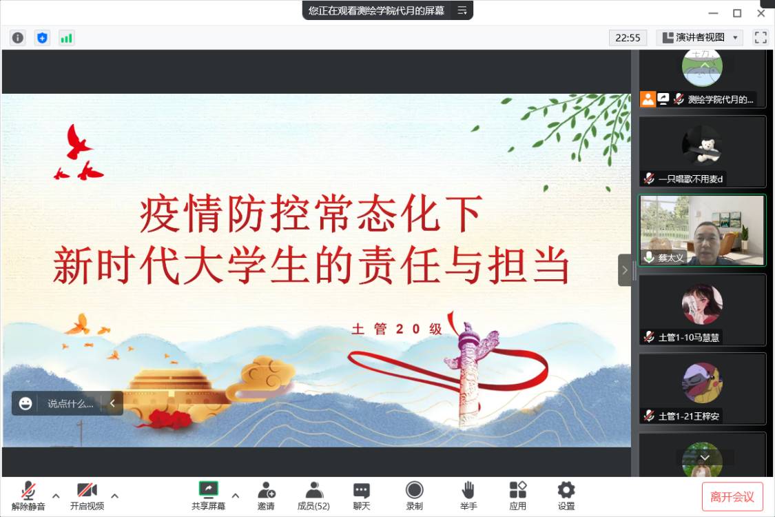 本次主题班会由各年级辅导员、班主任和学业导师等通过线上会议的形式灵活组织开展,紧紧围绕“强化理想信念教育,弘扬爱国主义精神”“加强遵规守纪教育,凝聚同心抗疫力量”“加强网络道德教育,营造清朗网络空间”三个方面进行。会上,老师带领同学们学习习近平新时代中国特色社会主义思想,深刻领会党的二十大精神,勉励同学们向抗击疫情过程中涌现的先进典型学习,增强抗疫责任担当,自觉做伟大抗疫精神的弘扬者和践行者;结合当前疫情形势,进一步加强疫情防控教育,科学普及防疫知识,加强疫情防控警示教育典型案例通报,引导同学们主动参与防疫,人人配合抗疫,自觉遵守各项疫情防控规定;积极宣传科学防控主旋律,引导和教育同学们自觉遵守网络法律法规和网络道德规范,不造谣、不信谣、不传谣,打造清朗网络空间,传递青春正能量,为全面落实公司疫情防控工作营造良好氛围、凝聚同心力量。