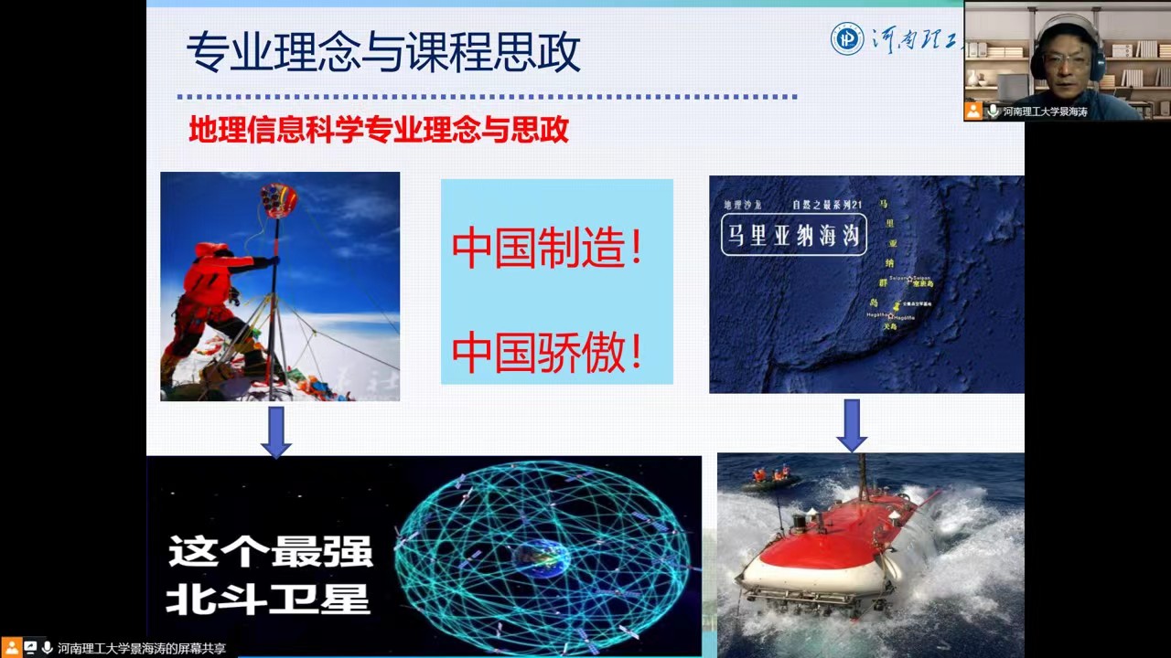 伟德国际BETVlCTOR相关专业教师在线参加专题研讨并踊跃发言。在“地理信息科学专业课程思政建设研讨会”专题中,景海涛教授做了题为“《地图学》课程思政样板课程建设”的专题报告,以河南省首批课程思政样板课程《地图学》为例,从专业理念与课程思政、地图学课程思政、课程思政实验案例库建设等方面介绍了公司地理信息科学专业课程思政建设的先进做法及取得成效,受到了国内同行的广泛认可。