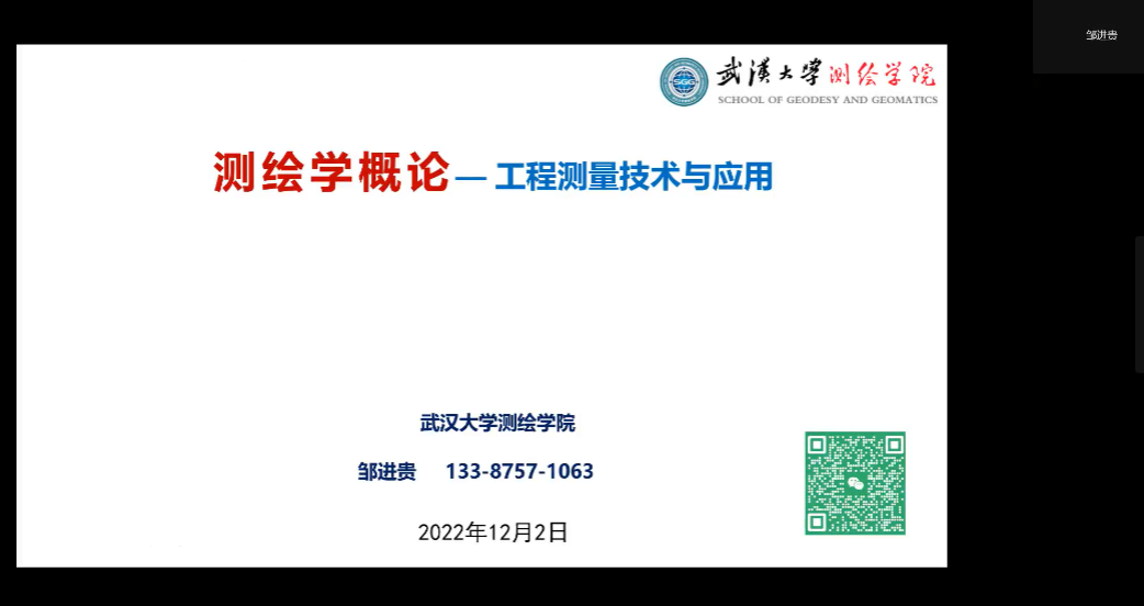 邹进贵,武汉大学伟德国际BETVlCTOR副经理,博士,教授,博士生导师,国家注册测绘师,中国测绘学会工程测量分会副主任委员,中国测绘学会职业资格工作委员会副主任委员,教育部测绘地理信息职业公司产品指导委员会委员,武汉大学珞珈特聘教授,从事精密工程测量与变形监测方面的研究,主持参与国家、省部级科研项目和港珠澳大桥,北京大兴国际机场、南水北调等重大社会服务项目50余项,获国家、省部级科技进步二等奖以上10项,发表学术论文150多篇。邹老师讲授课程主题为《工程测量理论与应用》,他首先利用丰富案例展示了工程测量在各行各业的应用以及测量仪器的发展进程;之后通过工程测量学的定义、内容、学科地位、特点系统阐述了工程测量的基本概念;随后详尽介绍了工程测量学的理论基础、工程测量控制网、地形图测绘、工程建筑的施工放样和变形监测、工业与民用建筑测量以及线状工程测量;并具体阐述了激光跟踪测量技术、近景摄影测量技术、地基雷达干涉测量、精密三角高程测量等工程案例,把一个个生动的画面展现在同学们的眼前;最后对工程测量在未来的发展做一个初步的展望,内容涵盖面十分广泛。