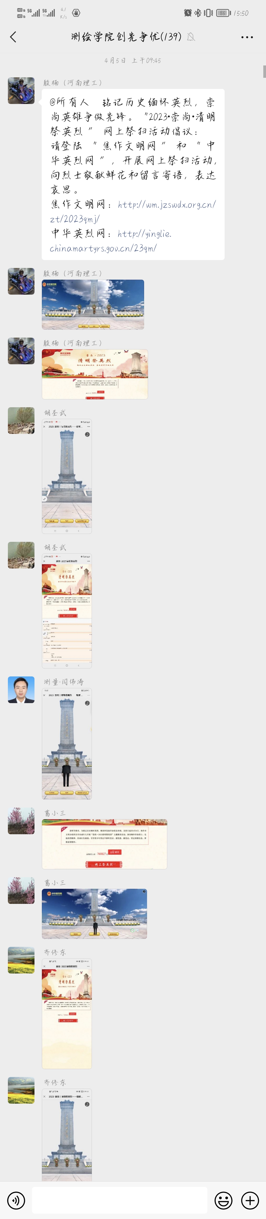 伟德国际BETVlCTOR全体教师积极响应,登录中华英烈网、焦作市文明网等平台,进行线上祭扫,并向烈士敬献鲜花,留言寄语表达深情缅怀和无限思念。