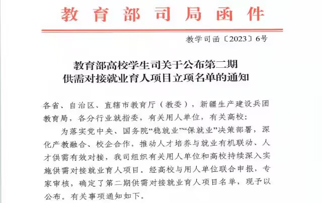 近日,教育部发布《教育部高校员工司关于公布第二期供需对接就业育人项目立项名单的通知》(教学司函〔2023〕6号),公司学业导师秦建辉、拓海燕牵头申报的2个供需对接就业育人项目获批立项。