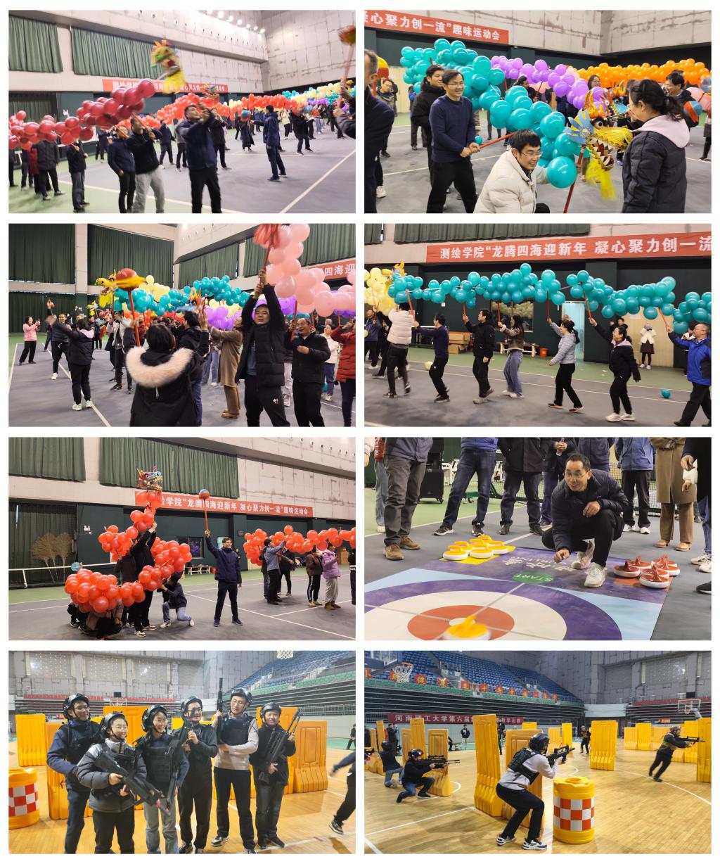 运动会上,学院全体教职工齐聚一堂,分为八个小组,各小组凝心聚力,协同并进,共襄盛举,展现了极高的团队和竞技精神。此次趣味运动会共举办三个活动:活动一“龙腾盛世”,教职工们以小组为单位,共同完成组龙、画龙、训龙、舞龙一系列趣味挑战,展现团队协作的力量;活动二“旱地冰壶”,教职工们在模拟冰壶比赛中体验冰雪运动的魅力,锻炼战略思维和协调能力;活动三“战火青春”,教职工们通过真人CS拓展训练,提升心理素质,凝聚团队精神。活动现场,笑声和欢呼声此起彼伏。教职工们通过一系列有趣的活动,不仅锻炼了身体,增进了友谊,还感受到了运动的快乐和团结的力量。