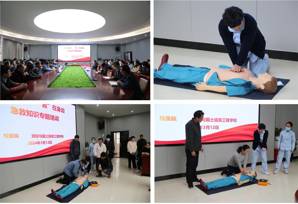 此次培训由理论知识讲解和现场模拟实操两部分组成。校医院医务科主任袁锋详细讲解了CPR心肺复苏和AED使用技术。校医院护理部主任李二芳及医务人员利用人体模型,现场演示了心肺复苏、AED除颤、海姆立克急救法的基本流程和操作步骤。