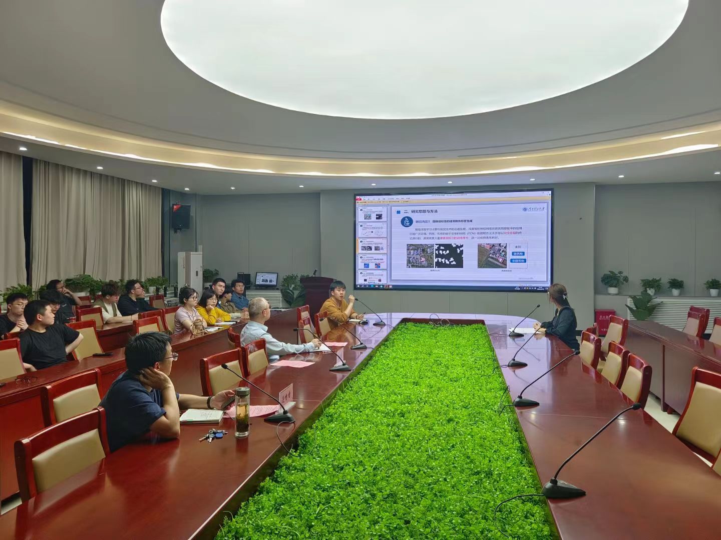 交流会上,22级硕士生闫戈丁和刘元元分别进行了题为《基于多尺度编码器-解码器神经网络的遥感影像建筑物提取》和《基于多源遥感的湿地景观演变及对流域生态安全的影响》的报告。之后,与会专家充分肯定了两位报告人的研究工作,并针对图像的分辨率、图像级的像素以及建筑物边界处理精度等方面提出了建设性的意见,指出了存在的不足之处。在交流环节,与会同学们也纷纷提出了自己的疑惑,得到了老师们的解答。现场讨论激烈,展现出了浓厚的学术氛围。