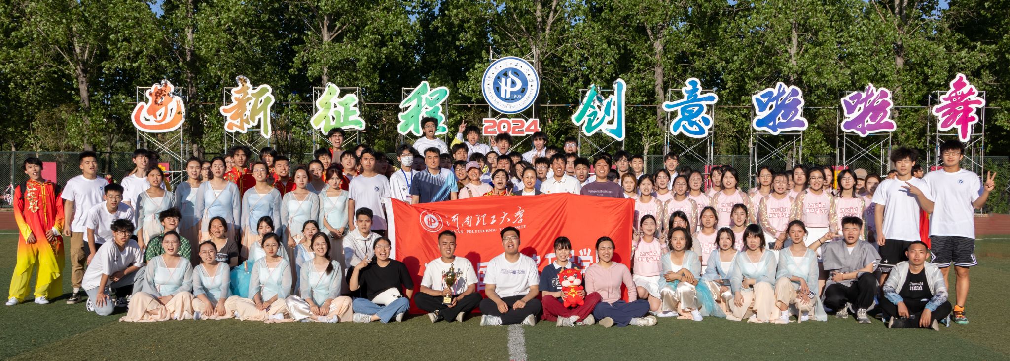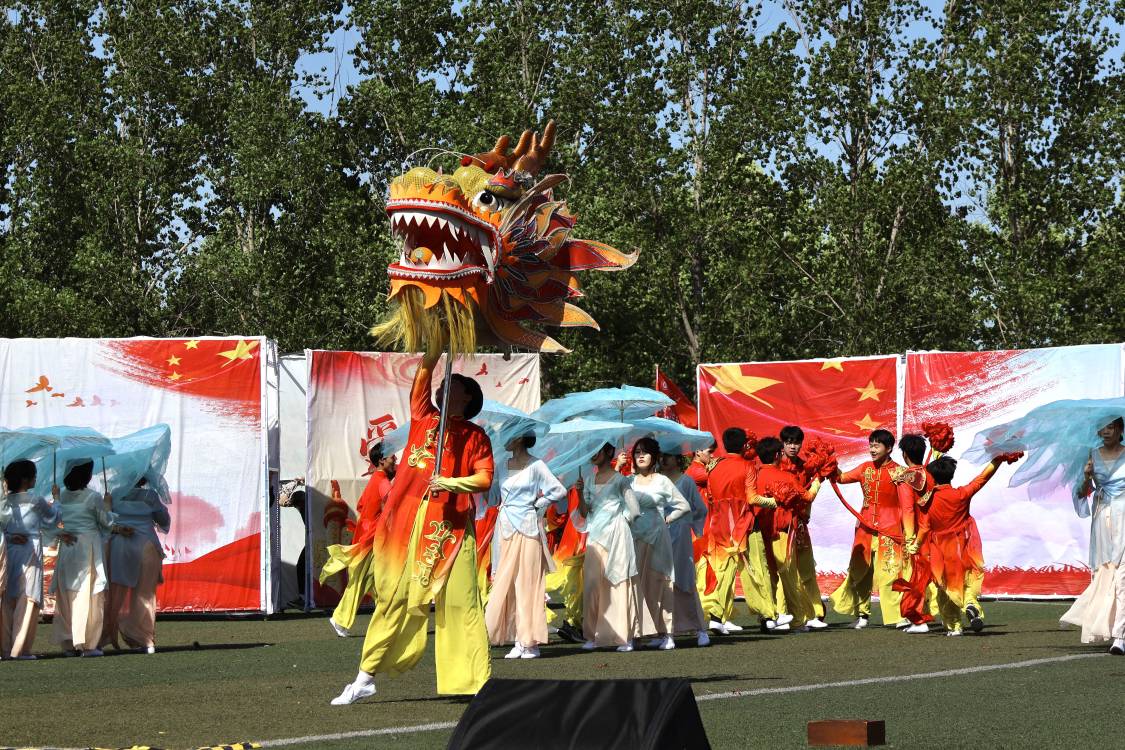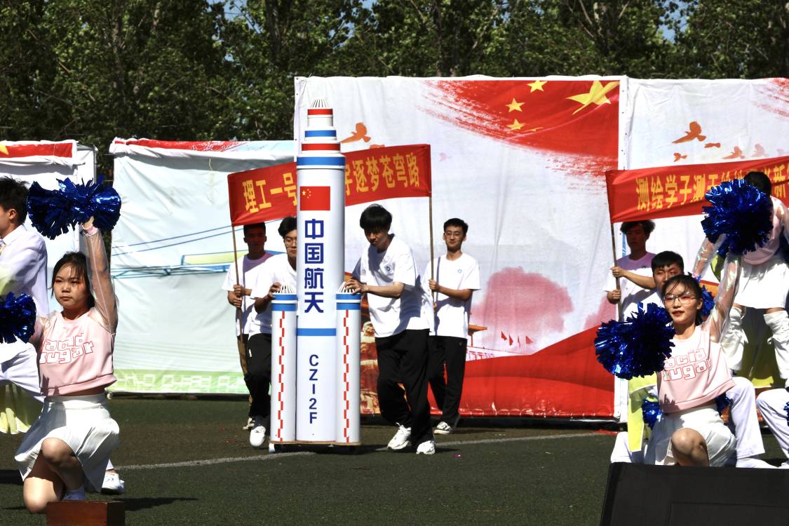 比赛过程中,同学们秉承测绘精神,熟练运用各个道具,融合了科技元素和艺术美感,通过三幕的演出,讲述了测绘的起源、发展与传承,歌颂着中华民族的自强不息,并在结尾以龙头为首,花伞、花球为身,盘曲成龙,昂首向前,展望未来。